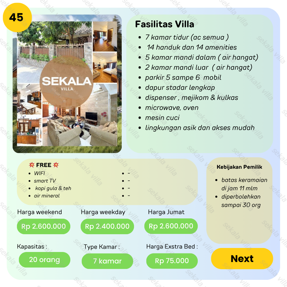 Kami akan membantu anda mencari villa sesuai kebutuhan anda dari harga Rp. 500.000 – Rp. 4.000.000/malam. Dengan senang hati admin kami akan membantu anda 😊 bisa telfon atau whatsappÂ