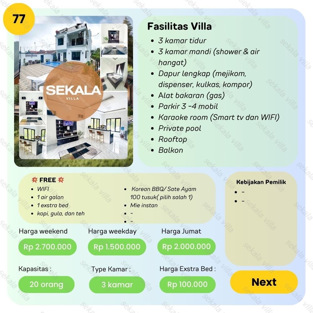 @sekalavilla Villa Tawangmangu No.77 – Kapasitas : 25 orang – 3 Kamar tidur – 3 Kamar mandi (shower & air hangat) – Tersedia karaoke set (smart tv & wifi) – Perlengkapan dapurnya lengkap – Bangunan baru – Free BBQ & 1 extra bed – Private pool – Halaman luas – Pemandangannya indah – Dekat dengan kebun strawberry – Rooftop + Balkon – Parkirannya cukup untuk 3 mobil NOMER ADMIN HANYA ADA YANG DI BIO #sekalavilla #villatawangmangu #katalogvillatawangmangu #staycation ♬ Enjoy Life – INOD